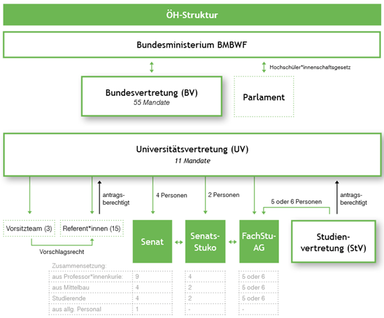 Es ist am besten, wenn wir den Aufbau der ÖH und die Universitätgremien trennen, auch wenn hier durch diverese Entsendungen viele Überlappungen gegeben sind. Beginnen wir mit der „ÖH“: