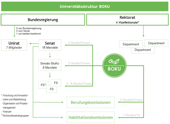 Folgende Grafik verdeutlicht, dass einige Studierende von der ÖH BOKU in Gremien entsandt werden, um die Meinung der Studierenden zu vertreten. Einerseits werden auf Vorschlag der Studienvertretungen Studierende in die „Fachstudienarbeitsgruppen“ (FachStuAGs) entsendet, wo immer ein Drittel der stimmberechtigten Mitglieder Studierende sind. Hier werden wichtige Entscheidungen und Änderungen zu den Curricula getroffen. Alle Entscheidungen werden anschließend in der „Senatsstudienkommission“ überprüft und abgeglichen – hier werden von der Universitätsvertretung der ÖH BOKU nach Wahlergebnis zwei Studierende (von acht Mitgliedern) entsandt. Die oberste Ebene ist der „Senat“. Hier sitzen vier Studierende.