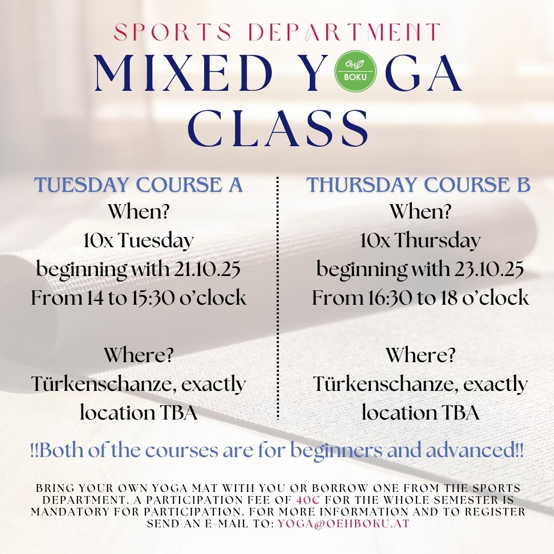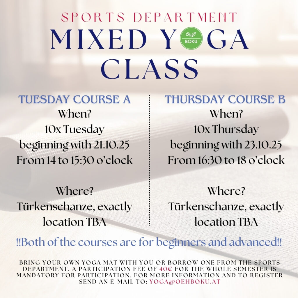 Take a break from everyday life and bring your body and mind into harmony! Whether you’re new to yoga or have been practicing for a while, our class offers the perfect blend of movement, relaxation, and mindfulness. Feel the energy, find your inner balance, and leave stress behind. Sign up now and secure your exclusive offer at the ÖH BOKU MIXED YOGA CLASS! Secure your spot and write an E-Mail to yoga@oehboku.at – limited space is available.